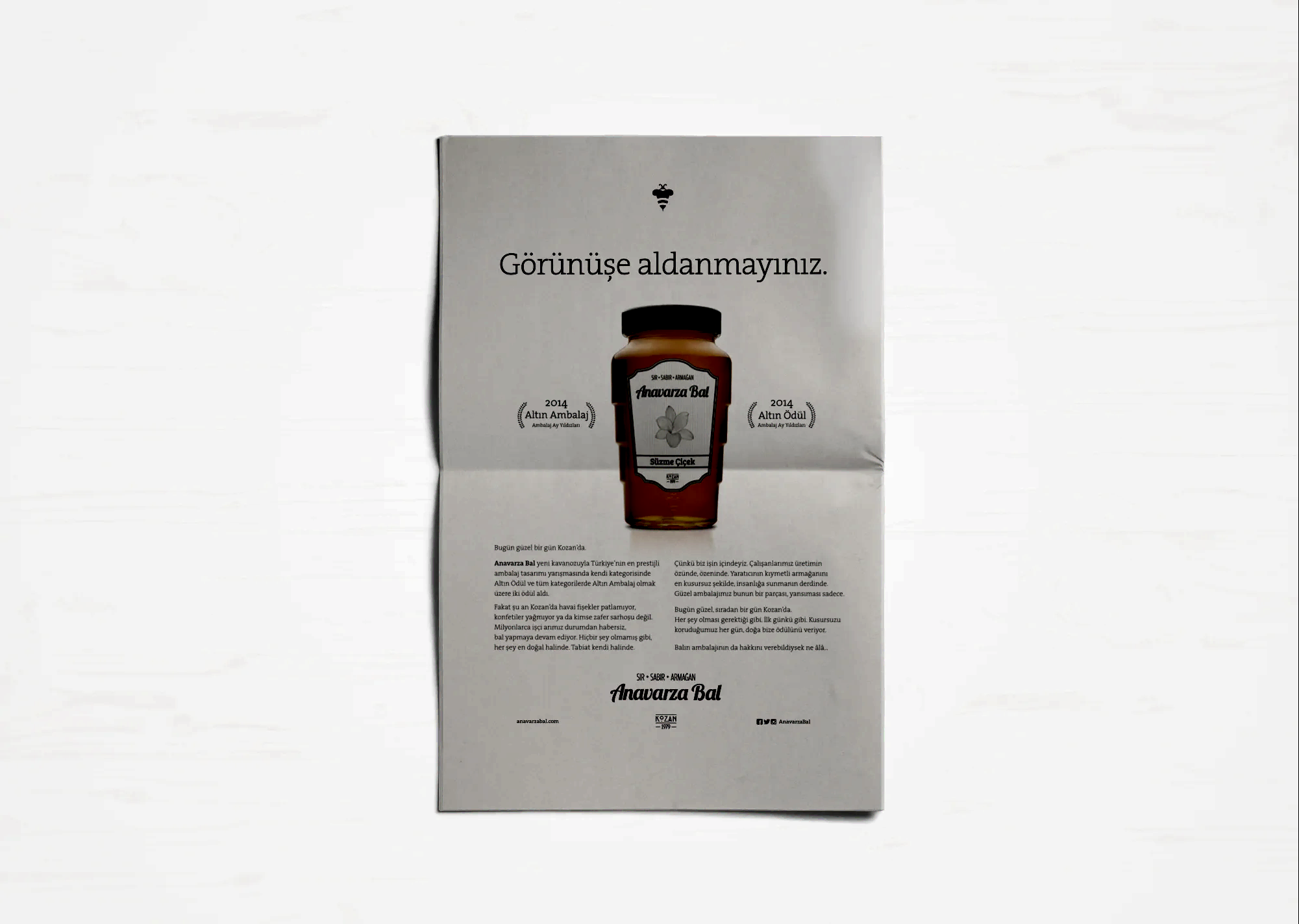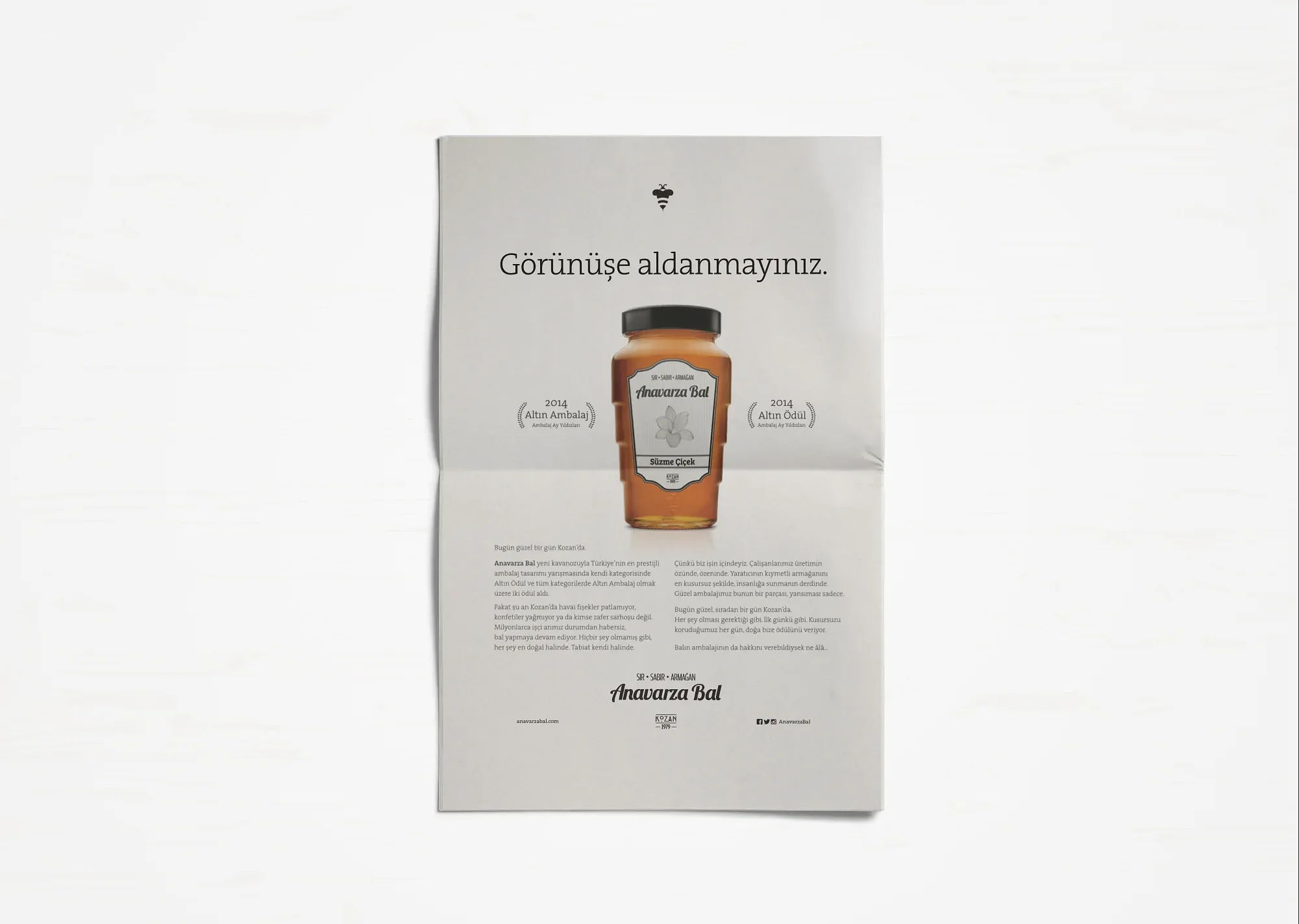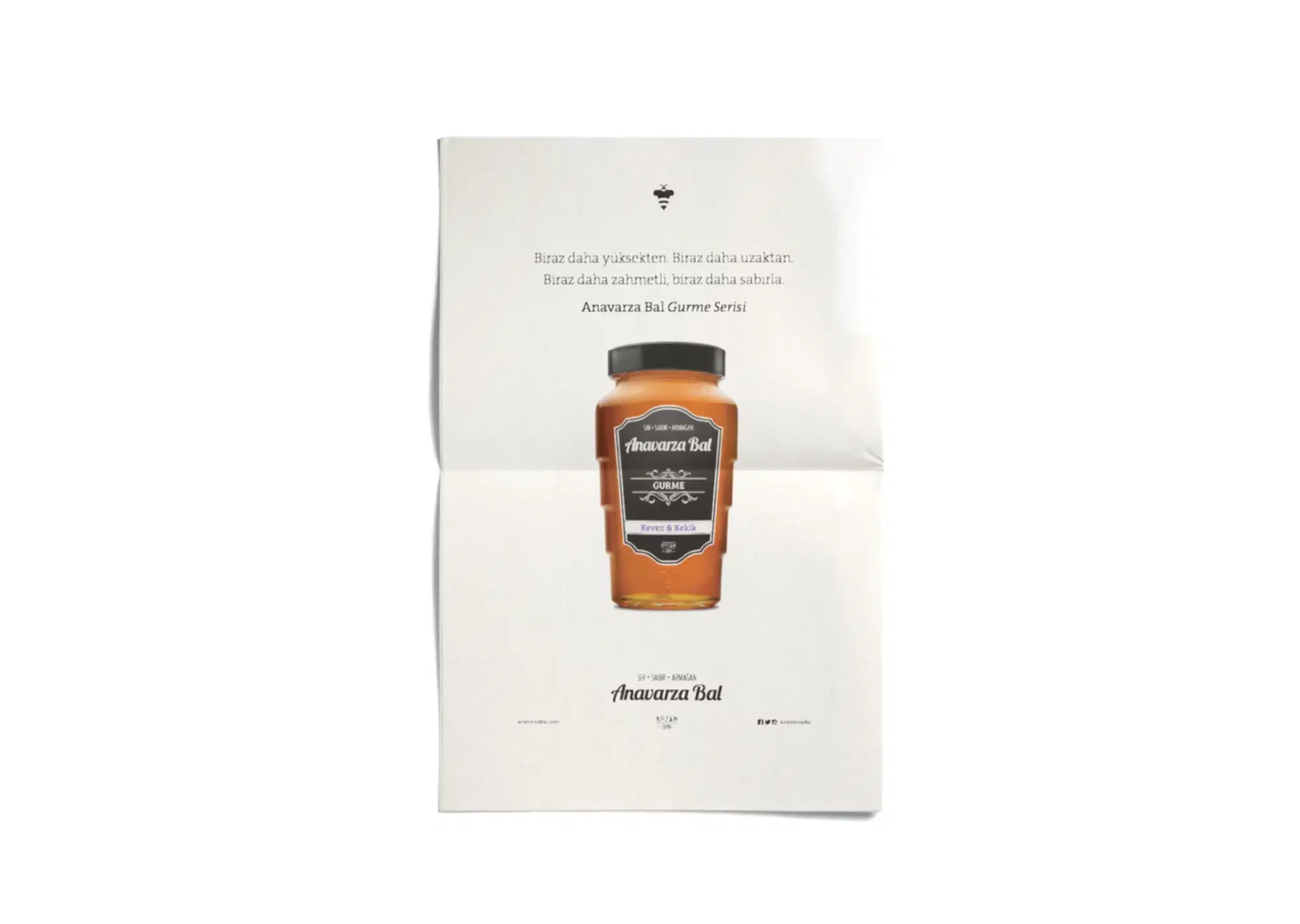 Uğrunda binlerce arının milyonlarca kilometre kanat çırptığı, arıcının toplamak için aylarca sabırla beklediği balın ziyan olmaması ve değerinin anlaşılması için kolları sıvadık. Arının üretim sürecini benimsediğimiz “sır, sabır, armağan” marka söylemi kimliğin tamamlayıcısı olarak geliştirildi. Arı’ya saygı duruşu fikriyle hazırlanan yeni logo ve görsel yaklaşımla da tüm iletişim malzemeleri yenilendi. Anavarza ambalajıyla ödüller kazandık ama aslında onun tasarımını biz yapmamış, doğadan almıştık.