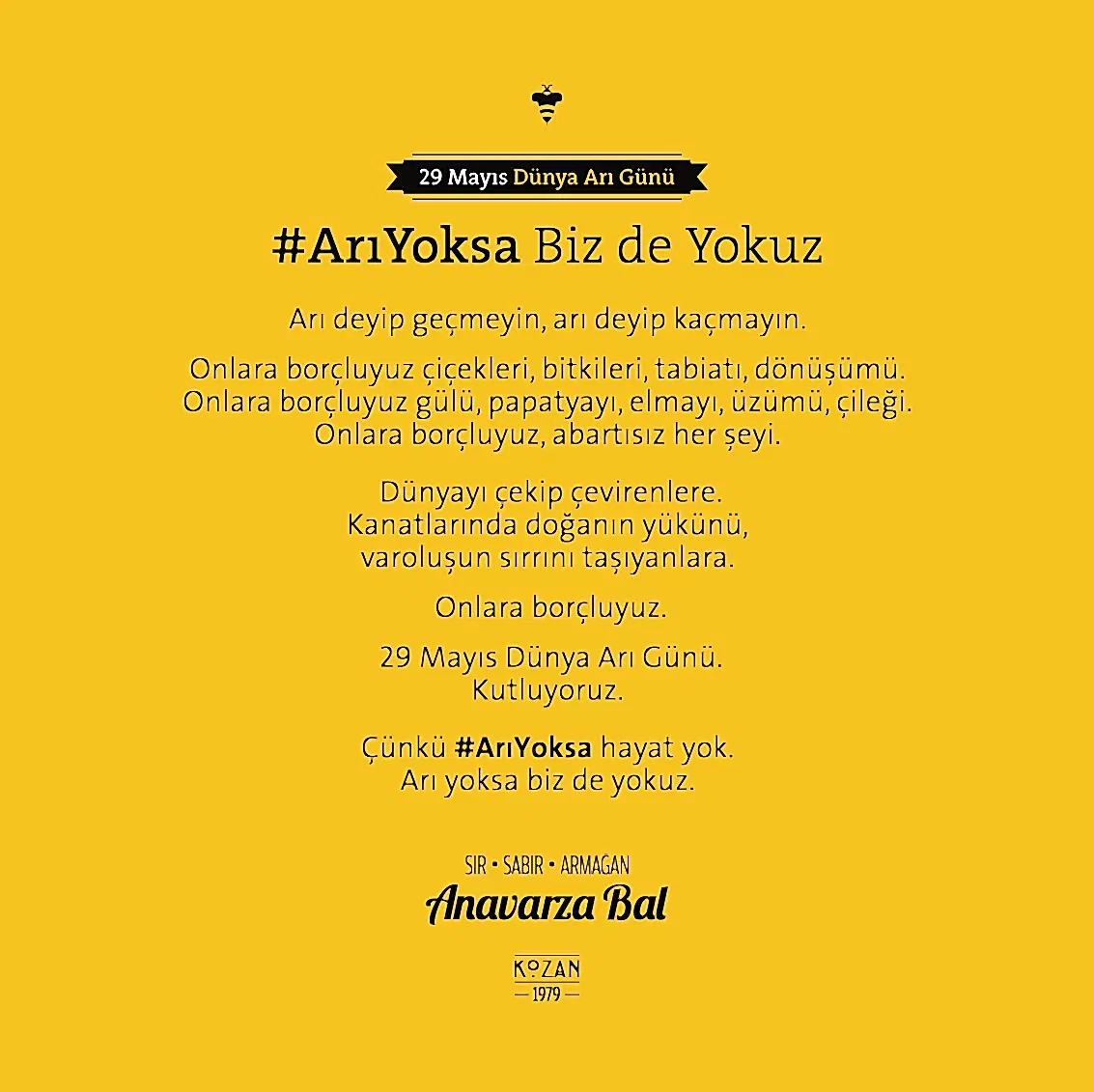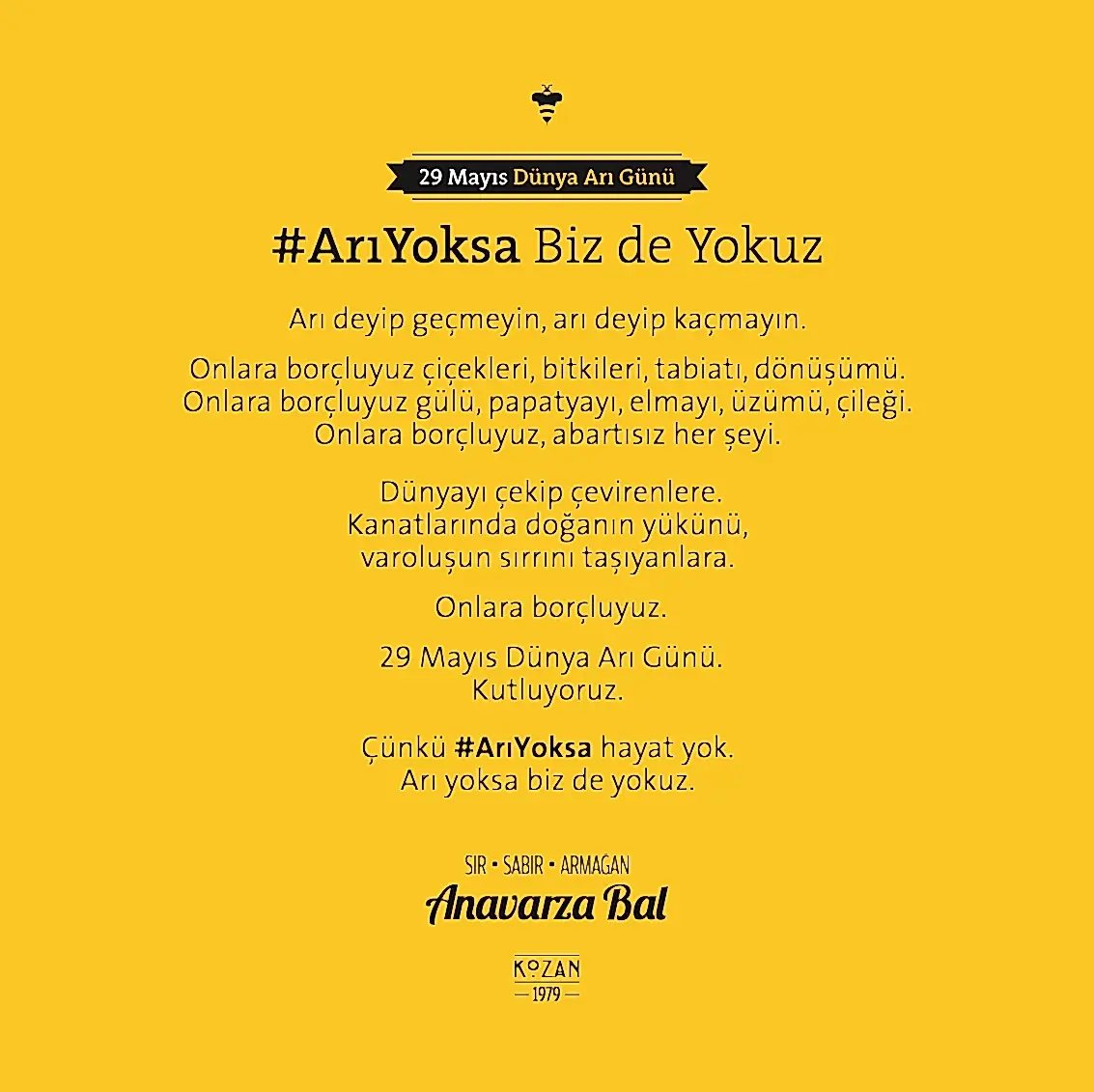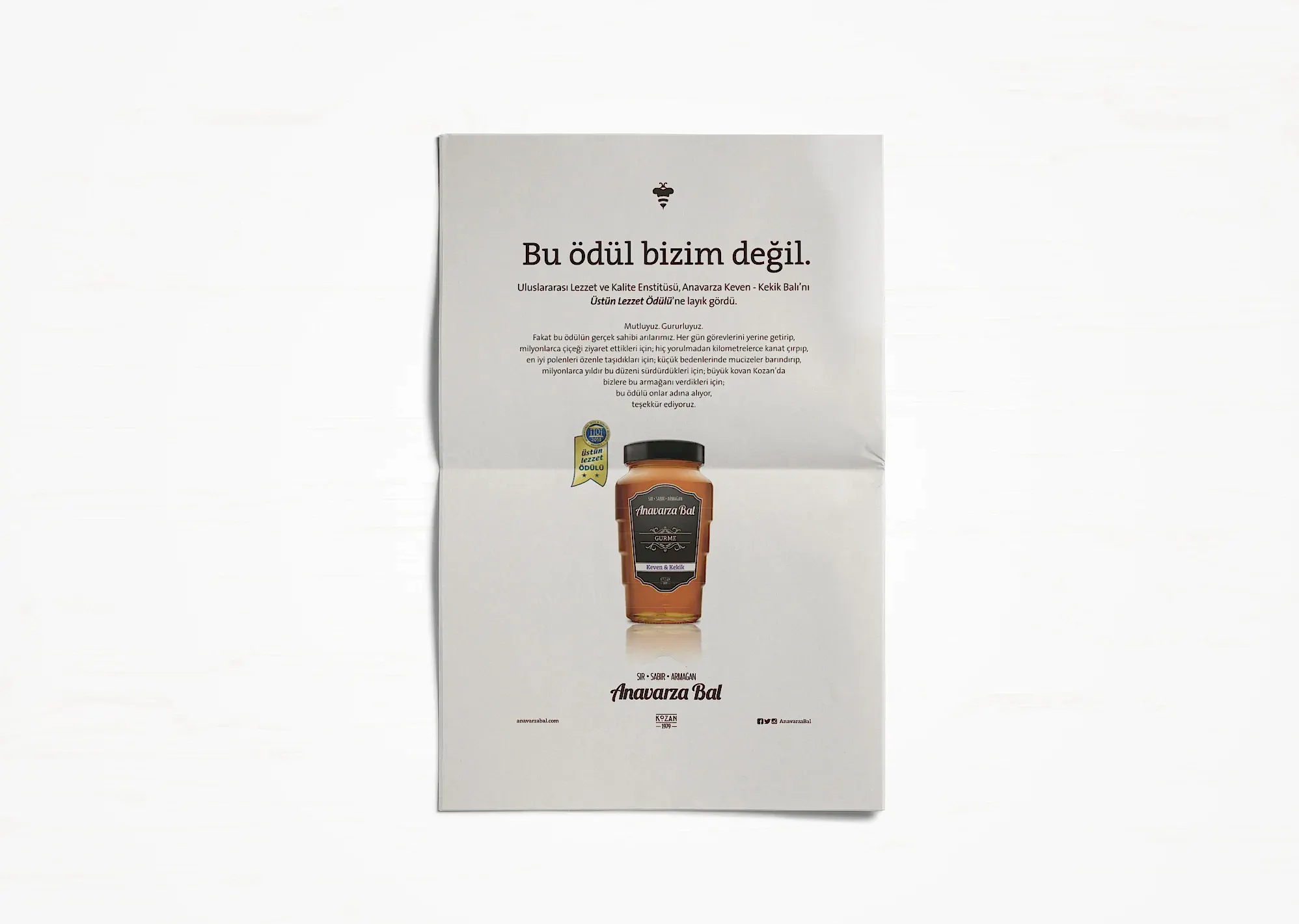 Uğrunda binlerce arının milyonlarca kilometre kanat çırptığı, arıcının toplamak için aylarca sabırla beklediği balın ziyan olmaması ve değerinin anlaşılması için kolları sıvadık. Arının üretim sürecini benimsediğimiz “sır, sabır, armağan” marka söylemi kimliğin tamamlayıcısı olarak geliştirildi. Arı’ya saygı duruşu fikriyle hazırlanan yeni logo ve görsel yaklaşımla da tüm iletişim malzemeleri yenilendi. Anavarza ambalajıyla ödüller kazandık ama aslında onun tasarımını biz yapmamış, doğadan almıştık.