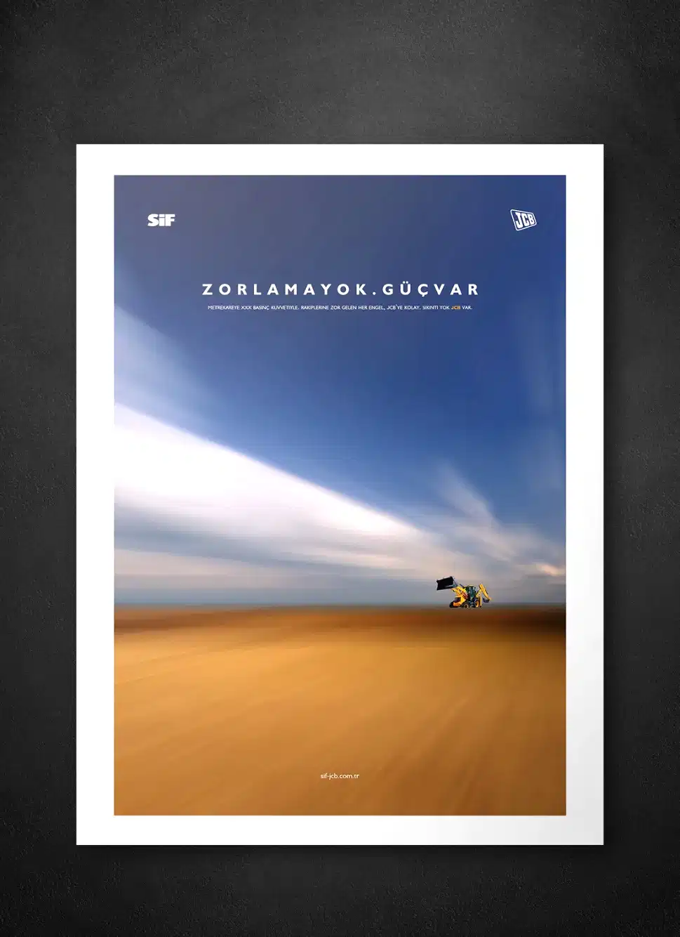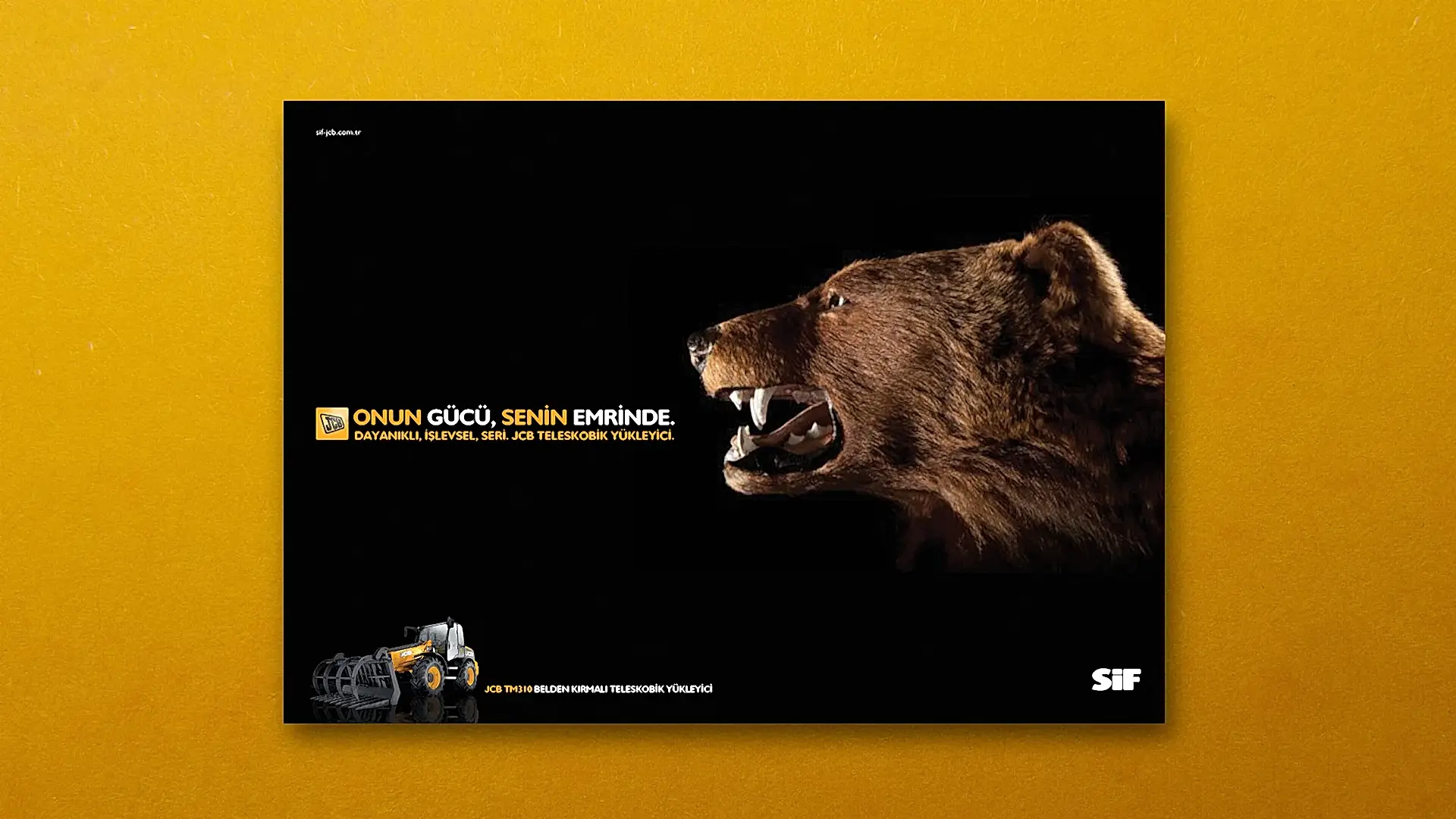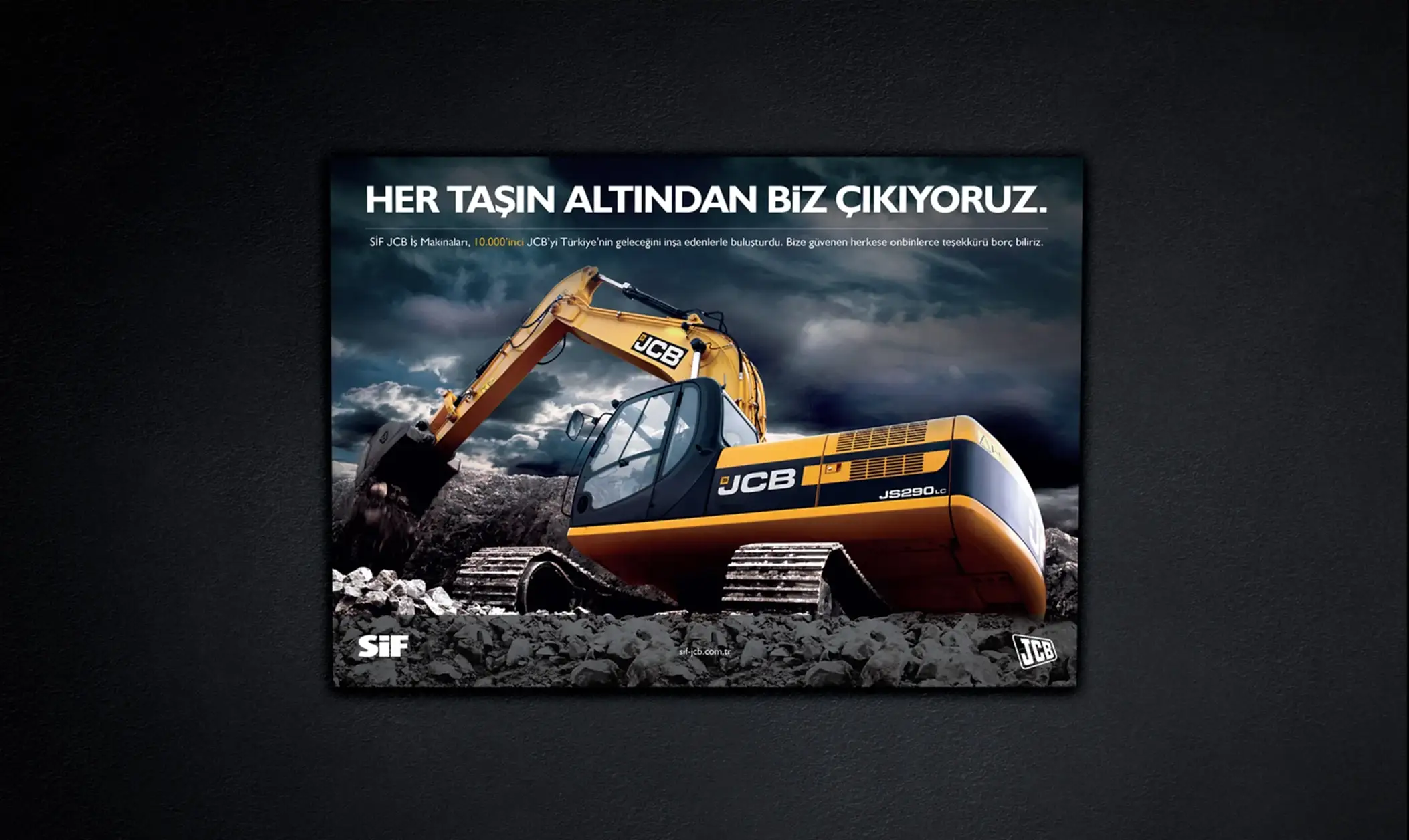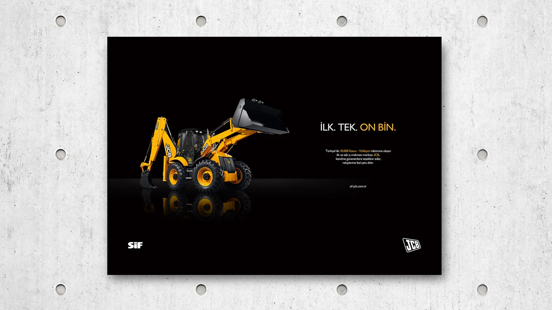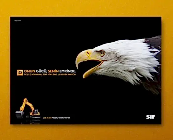 JCB ve Türkiye’deki dağıtımcısı SİF, sektöründe uzmanlıklarıyla bilinen, popüler ve köklü markalardı. Çok fazla söz söylemeye ihtiyaçları yoktu. Biz de o yüzden az söz içeren, SİF ve JCB’nin işbirliğini ön plana çıkaran ve yeni ürünlerinin en çarpıcı özelliklerini tanıtan bir kampanya hazırlayarak 5 sene sürecek bir etkili ajans-müşteri ilişkisinin temellerini attık.