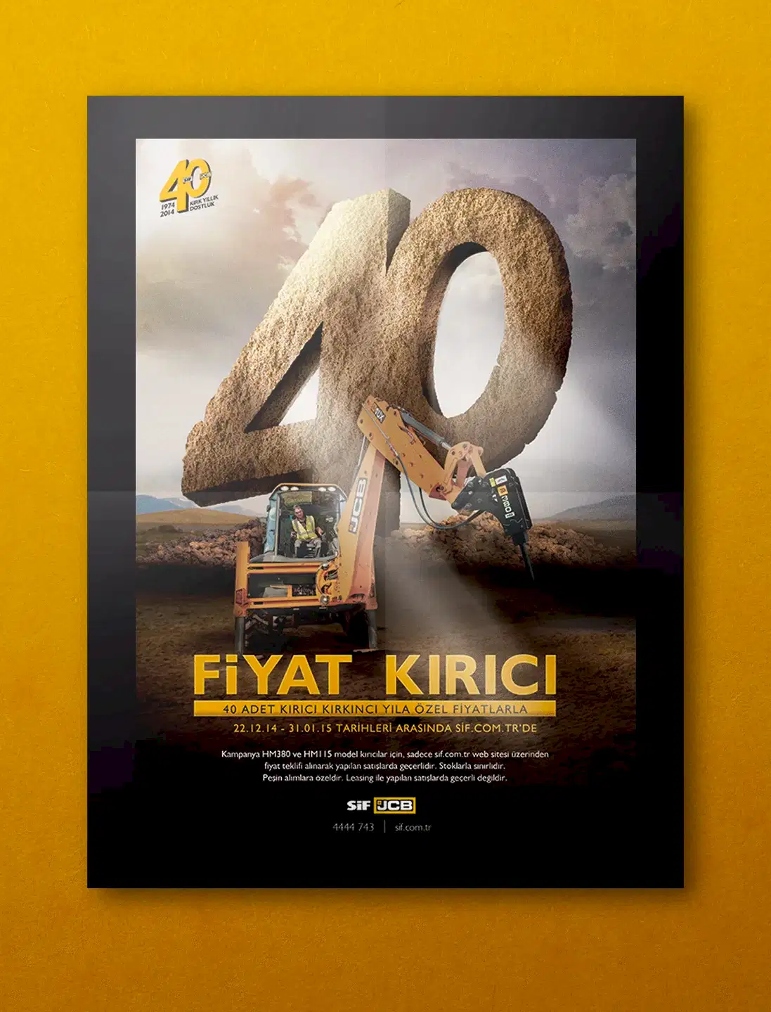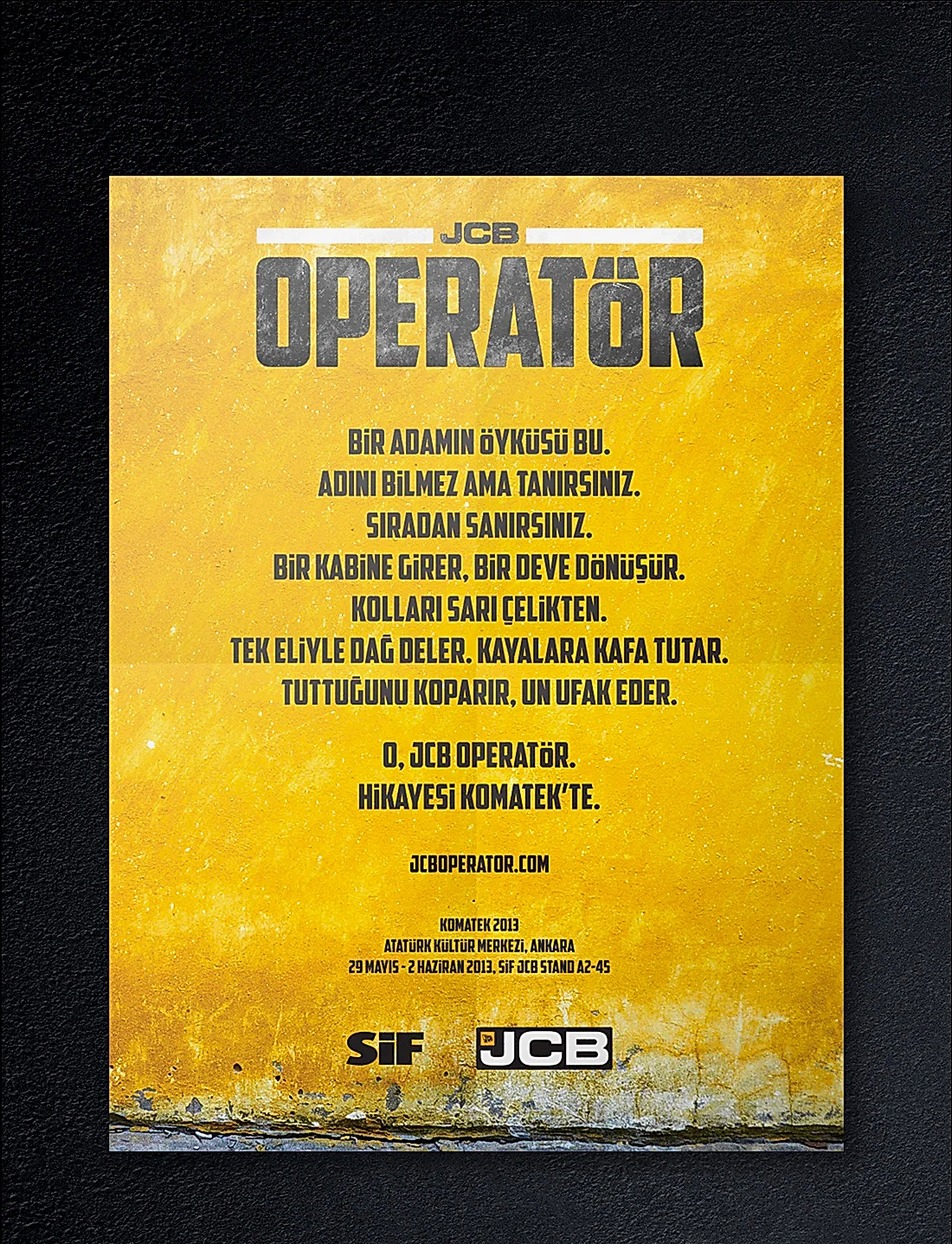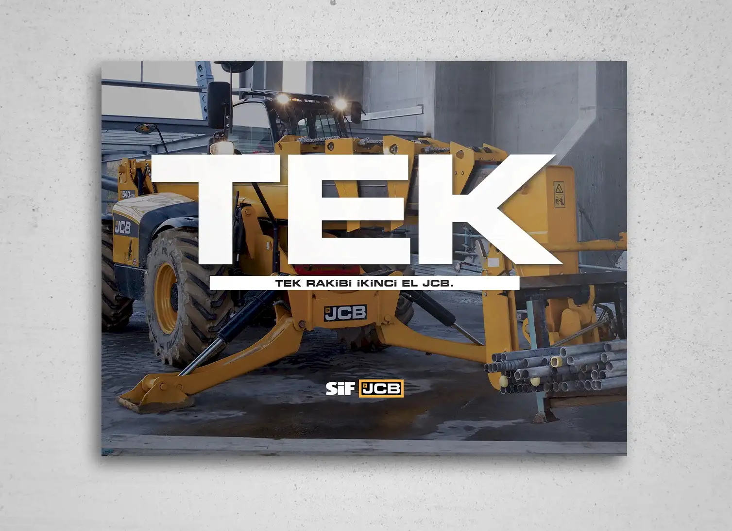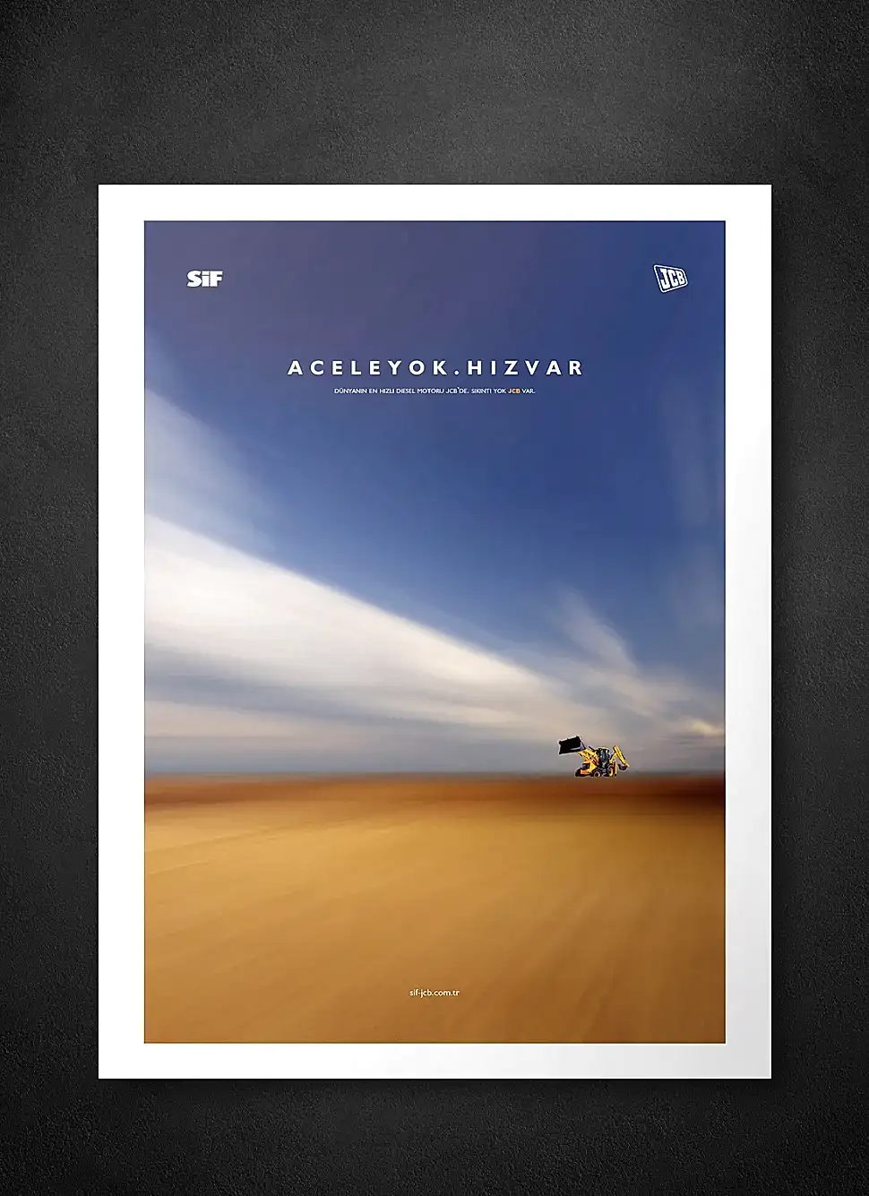JCB ve Türkiye’deki dağıtımcısı SİF, sektöründe uzmanlıklarıyla bilinen, popüler ve köklü markalardı. Çok fazla söz söylemeye ihtiyaçları yoktu. Biz de o yüzden az söz içeren, SİF ve JCB’nin işbirliğini ön plana çıkaran ve yeni ürünlerinin en çarpıcı özelliklerini tanıtan bir kampanya hazırlayarak 5 sene sürecek bir etkili ajans-müşteri ilişkisinin temellerini attık.