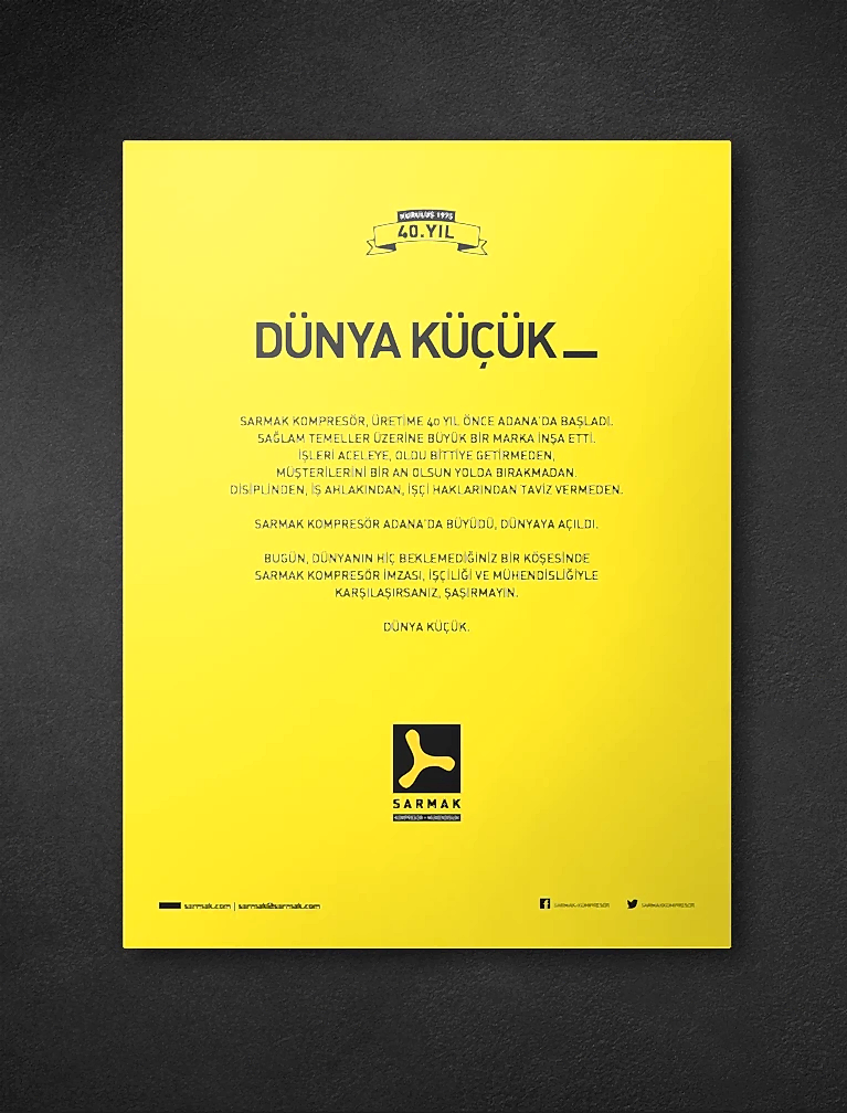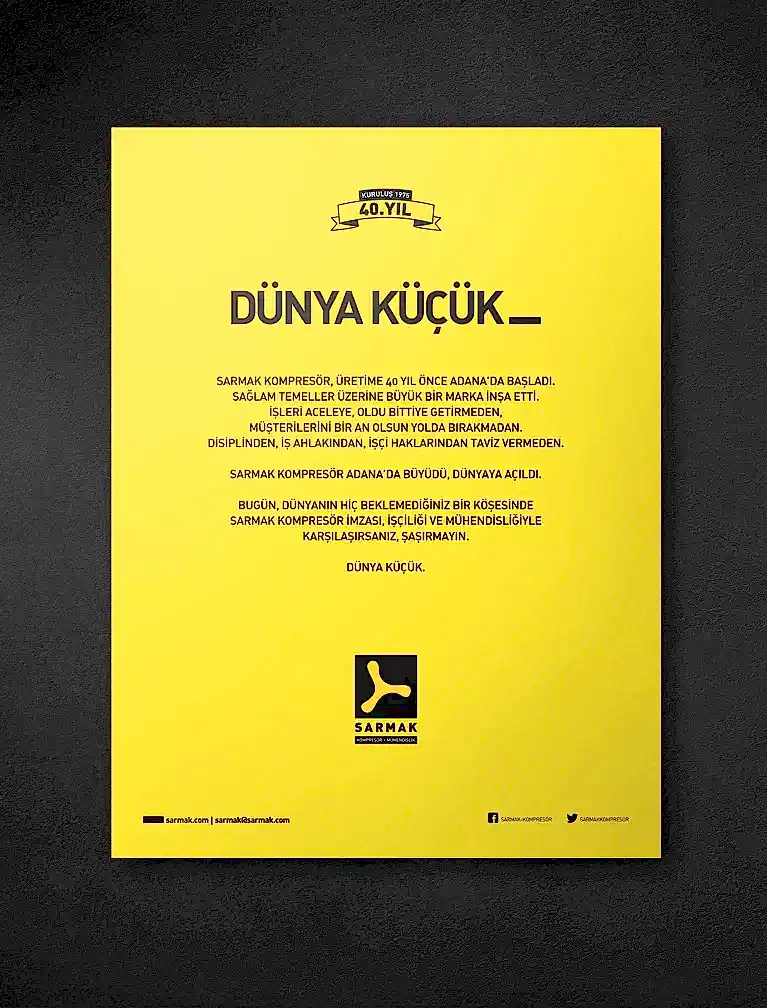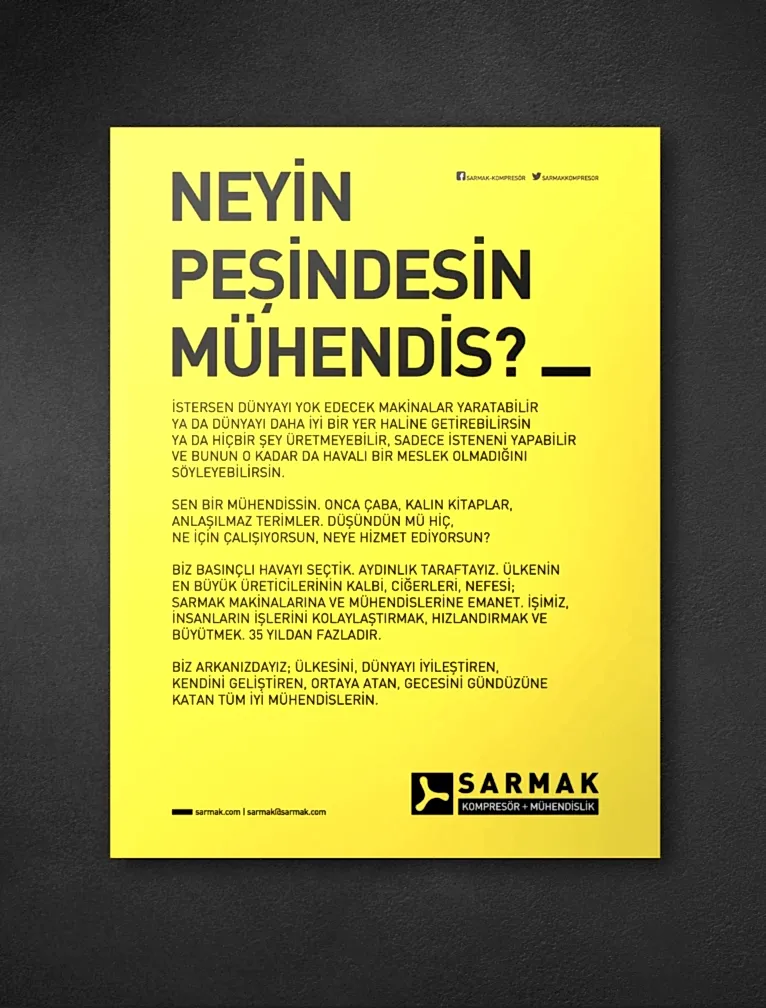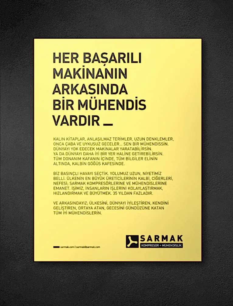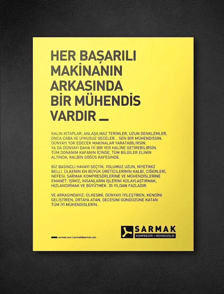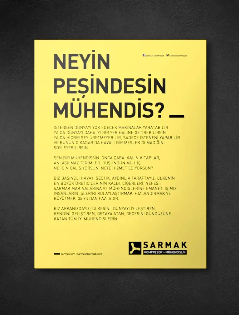Sarmak’ı sektörün önemli oyuncularından biri haline getiren, müşteri ve tedarikçileriyle kurduğu güvene dayalı ilişkilerin yanı sıra eşine az rastlanır bir disiplinle mühendislik yapıyor olmalarıydı. Sarmak’ın yeni marka kimliği ‘Mühendis’ olduğunu mutlaka hissettirmeliydi.
